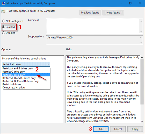حالا مثل عکس فوق ابتدا گزینه Enabled را فعال کنید و سپس از فیلدی که با شماره 2 مشخص کردهایم، گزینه Restrict X Drive Only را انتخاب کنید (دقت داشته باشید که حرف درایو در این بخش قابل انتخاب است و شما میتوانید از بین درایوهای موجود سیستم هر کدام که مد نظرتان است را انتخاب نمایید). نهایتا روی گزینه OK کلیک کنید تا تغییرات مورد نظر ذخیره شوند. بدین صورت پارتیشن انتخابی شما پنهان یا مخفی میشود و دیگر در بخش This PC نشان داده نخواهد شد. برای آشکار کردن درایو ها کافیست گزینه Disabled را انتخاب نمایید تا کلا قابلیت مخفی سازی درایوها در Group Policy Editor غیر فعال شود.