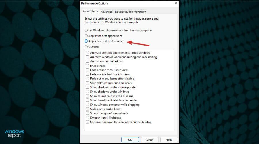 یکی دیگر از موثرترین روش ها و ترفندهایی که میتوانید از آن به منظور افزایش سرعت عملکرد ویندوز 11 استفاده کنید مربوط به غیر فعال کردن جلوه های بصری و ویژه میشود. برای انجام این کار کافیست عبارت View advanced system settings را در فیلد جستجوی ویندوز 11 سرچ کنید و آیکون مربوط به آن را اجرا نمایید. سپس در تب Advanced روی گزینه Settings کلیک کنید. در پنجرهای که مشابه با عکس فوق ظاهر میشود گزینه Adjust for best performance را انتخاب کنید و روی OK و Apply کلیک نمایید تا تغییرات مورد نظر اعمال و ذخیره شوند. همچنین میتوانید با انتخاب گزینه Custom از لیستی که ارائه شده، جلوه های بصری خاصی که مد نظرتان است را غیر فعال یا فعال کنید. هرچقدر جلوه های بصری بیشتری غیر فعال باشند، سرعت عملکرد سیستم عامل بیشتر میشود.