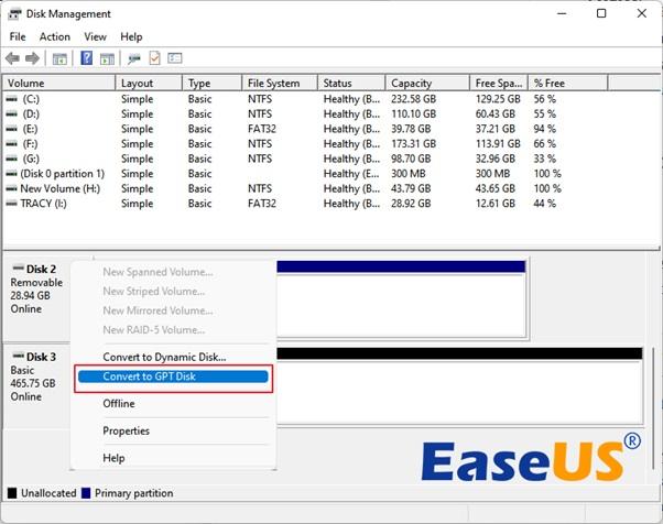 - در نهایت روی هارد دیسک مورد نظر کلیک راست کنید و گزینه Convert to GPT disk یا Convert to MBR disk را انتخاب نمایید.