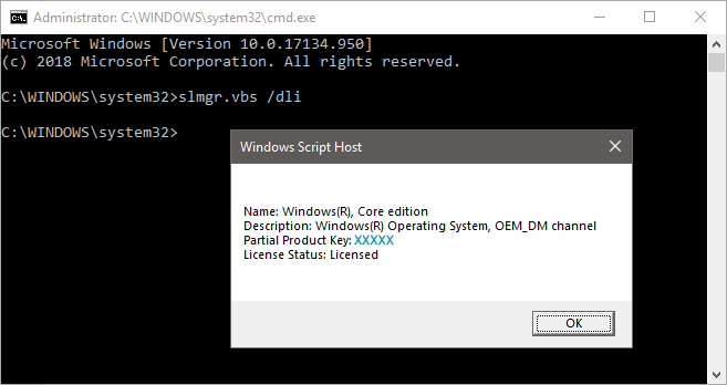 در پنجره CMD دستور slmgr.vbs /dli را وارد کرده و کلید Enter را بزنید. اگر لایسنسی روی کامپیوتر شما فعال باشد، پیغامی مشابه با عکس فوق دریافت خواهید کرد. ضمنا 5 رفم آخر Product Key فعلی شما هم در تصویر نمایش داده می‌شود.