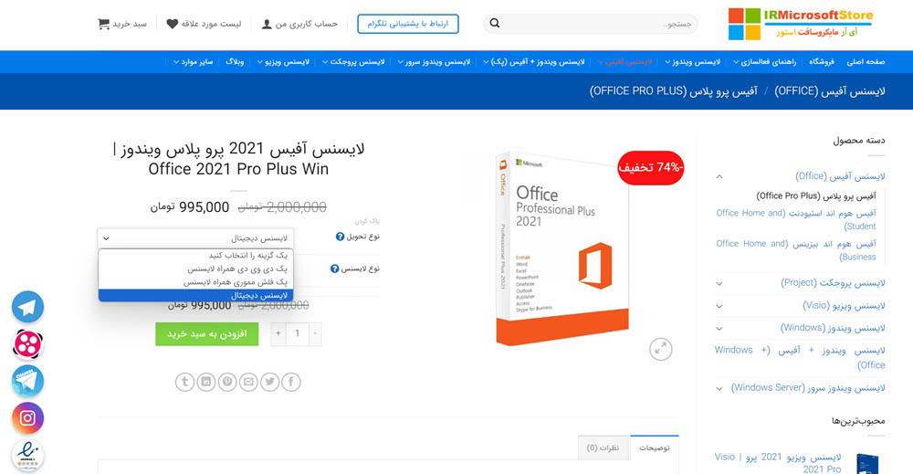 • با کلیک روی هر یک از دو گزینه ارائه شده زیر، لایسنس مناسب آفیس نصب شده روی سیستم را به صورت دیجیتال از آی آر مایکروسافت استور سفارش دهید تا برایتان ایمیل شود. معمولا ارسال لایسنس های دیجیتال ظرف 30 دقیقه از طریق ایمیل صورت می‌پذیرد: