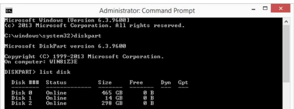 در این مرحله لیستی از فضاهای ذخیره سازی اطلاعات در دسترس کامپیوتر نشان داده میشوند. از این لیست به دنبال دیسکی باشید که مربوط به فلش مموری شما میشود. با مشاهده و بررسی حجم فضای ذخیره سازی دیسک های نمایش داده شده به راحتی میتوانید دیسک مربوط به فلش مموری خودتان را پیدا کنید. به عنوان مثال چون ما از فلش مموری 16 گیگابایتی استفاده کردهایم به راحتی متوجه میشویم که Disk 1 مربوط به فلش مموری ماست. پس از شناسایی دیسک فلش مموری دستورات زیر را وارد کنید: