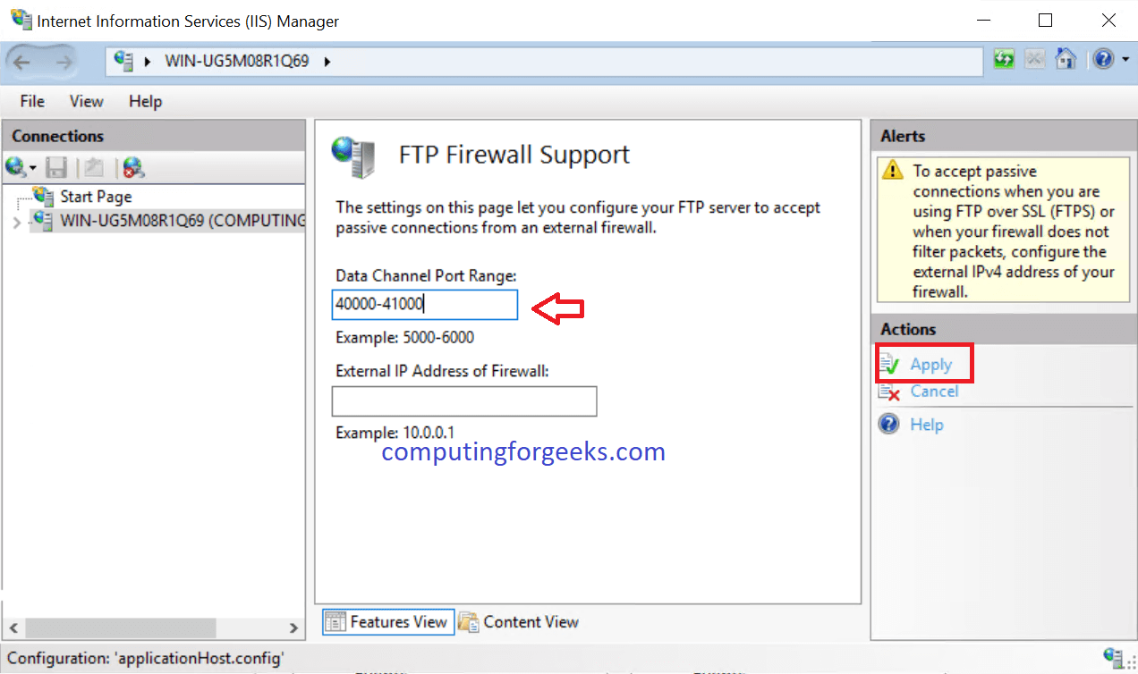 در این مرحله باید پورت رینج (Port Range) حالت منفعل (Passive Mode) را وارد کنید و سپس روی گزینه Apply کلیک نمایید تا تغییرات شما ذخیره شوند و پس از نصب FTP Server در ویندوز سرور 2019، حالت منفعل آن نیز فعال گردد. البته لازم است پس از انجام این تغییرات حتما یک مرتبه سرور را ریستارت کنید. بدین منظور: