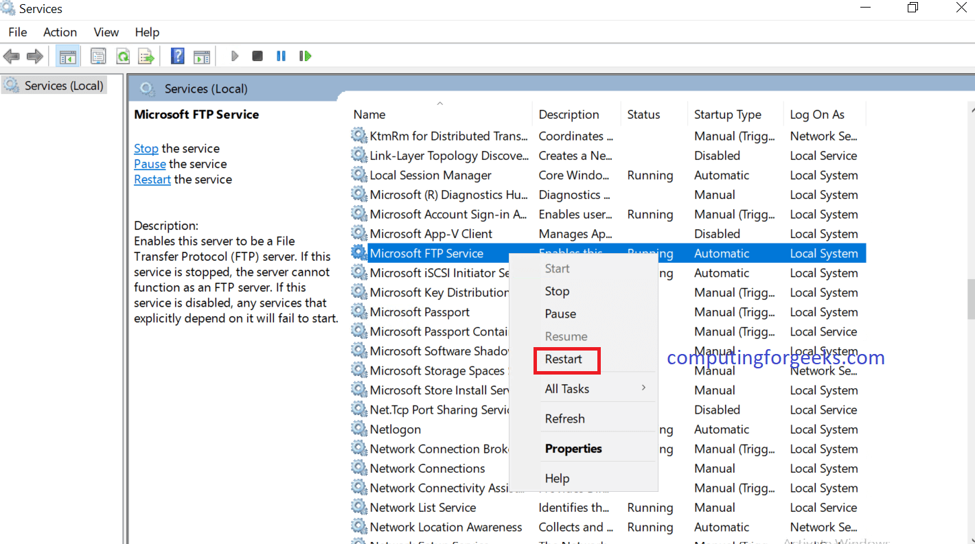 ابزار Service App را اجرا کنید و در لیست به دنبال Microsoft FTP Server باشید. روی این گزینه کلیک راست کنید و سپس بر روی Restart کلیک نمایید تا ریستارت سرور انجام شود. پس از اینکه ریستارت با موفقیت انجام شد میتوانید از حالت منفعل یا Passive Mode سرور FTP بدون محدودیت استفاده به عمل آورید.