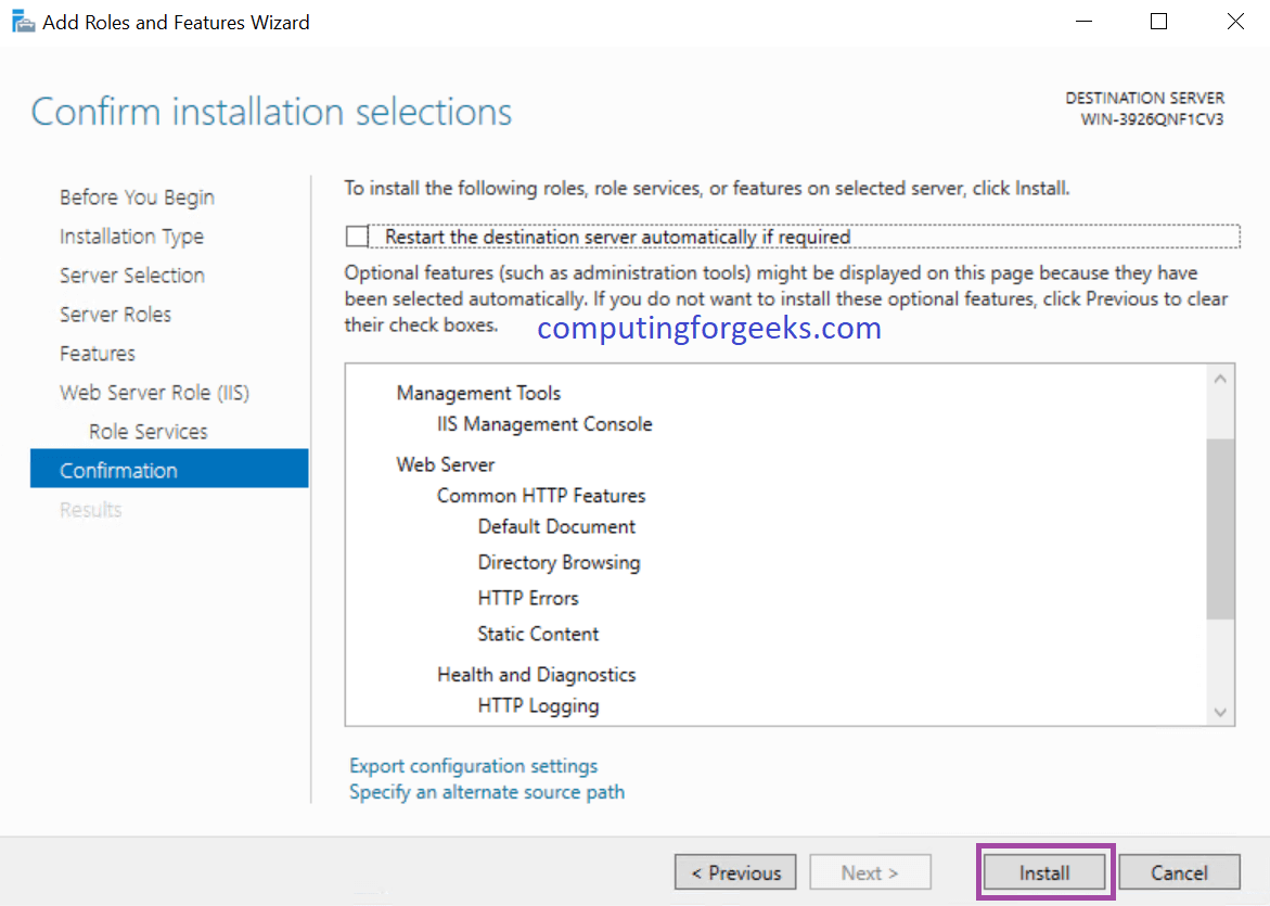 در مرحله آخر روی گزینه Install کلیک نمایید تا نصب FTP سرور آغاز شود. ظرف چند دقیقا این پروسه تکمیل خواهد شد. لازم به ذکر است که به منظور نصب یا همان راه اندازی FTP Server میتوان از دستورات پنجره PowerShell هم استفاده کرد که بیشتر در شرایطی مورد استفاده قرار میگردد که ورز« مجهز به GUI یا رابط گرافیکی ویندوز سرور که اصطلاحا به آن دسکتاپ اکسپرینس (Desktop Experience) هم گفته میشود در دسترس نباشد. در ادامه به آموزش انجام برخی دیگر از اقداماتی میپردازیم که احتمال دارد پس از فعال سازی سرور FTP به آن ها نیاز پیدا کنید.