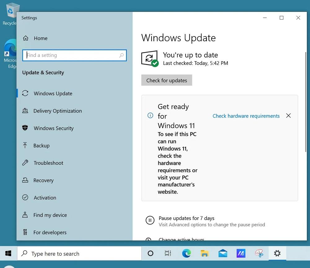 ابتدا به قسمت Settings > Windows Update بروید و روی گزینه Check for Updates کلیک کنید. مطمئن شوید که به شبکه اینترنت پر سرعتی وصل هستید تا سیستم بتواند با سرور های مایکروسافت ارتباط برقرار کند و آپدیت هایی که برای شما در دسترس هستند را نشان دهد. تمام آپدیت هایی که نمایش داده میشوند باید روی کامپیوترتان نصب گردند تا در نهایت وقتی روی گزینه Check for Update کلیک میکنید، مثل عکس فوق عبارت You’re up to date ظاهر گردد و هیچ به روز رسانی دیگری برای دانلود و نصب وجود نداشته باشد. در این شرایط پیغامی با عنوان Get ready for Windows 11 هم ظاهر میشود. برای شروع کار روی گزینه آبی رنگ این پیغام با عنوان Check hardware requirements کلیک کنید.