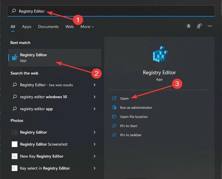 در فیلد جستجوی ویندوز عبارت Registry Editor را تایپ و جستجو نمایید و برنامه مربوط به آن را با کلیک روی گزینه Open یا Run as administrator اجرا کنید.