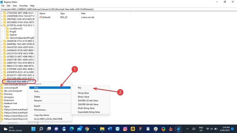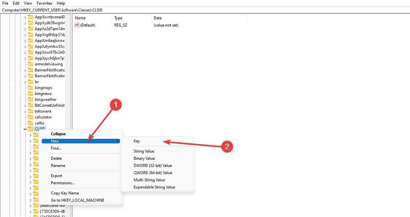 با طی کردن مسیر HKEY_CURRENT_USER\SOFTWARE\CLASSES\CLSI پوشهای که با نام CLISID مشخص شده را انتخاب کنید. روی این پوشه کلیک راست کرده و گزینه New را انتخاب نمایید و سپس روی گزینه Key کلیک کنید. بدین ترتیب دستور ساخت یک پوشه کلیک جدید در پوشه انتخاب شده صادر میشود.