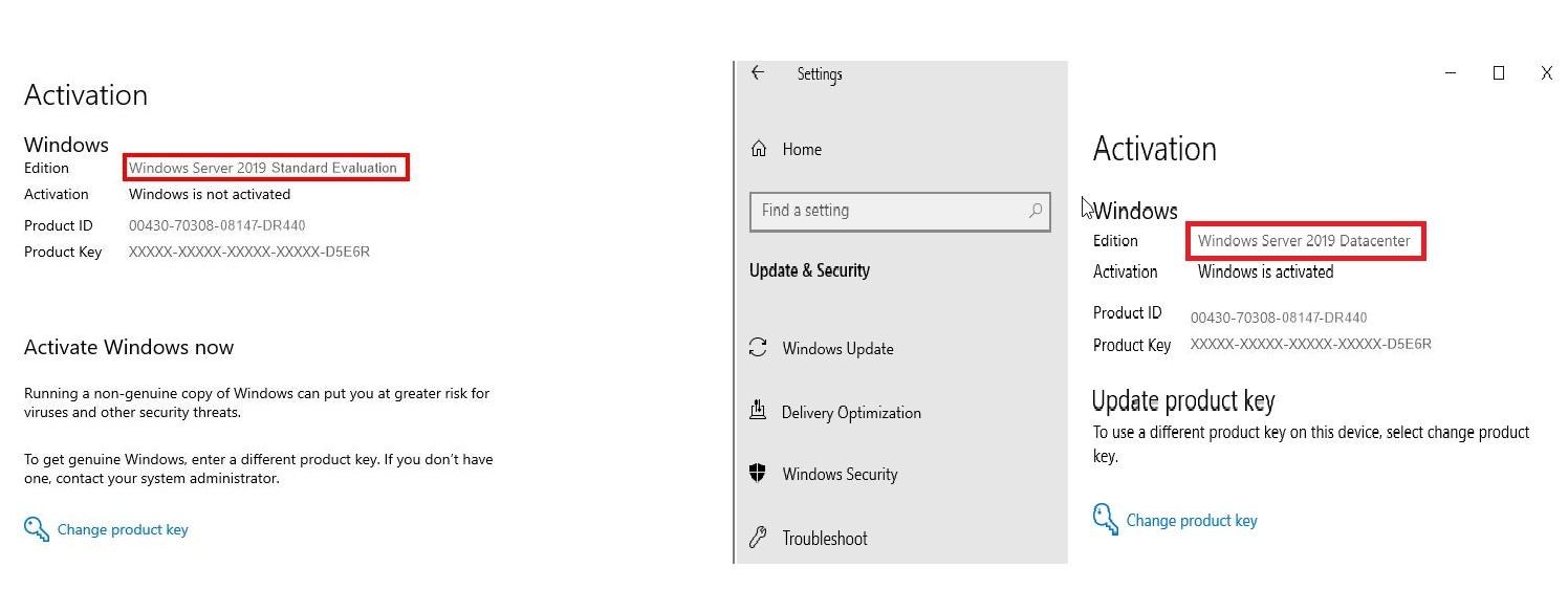 حتی بعد از نصب ویندوز سرور هم میتوان متوجه شد که آیا ادیشن فول (Full Version) آن روی دستگاه نصب شده یا نسخه اولوایشن (Evaluation Version) بر روی دستگاه نصب است! بدین منظور کافیست مثل عکس فوق به مسیر Settings > Activation بروید و نام دقیق ویندوز سرور را از کنار گزینه Edition مشاهده کنید! اگر نسخه فول نصب شده باشد، دیگری خبری از عبارت Evaluation در انتهای نام ویندوز سرور نخواهد بود اما اگر نسخه غیرفول نصب شده باشد در انتهای نام ویندوز سرور عبارت Evaluation قید میشود. یعنی درست مثل عکس بالا که در سمت راست نسخه Full نصب شده و در سمت چپ نسخه Evaluation نصب گردیده است.