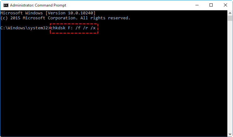 - دستور chkdsk F: /f /r /x را در پنجره CMD تایپ کنید و Enter بزنید.