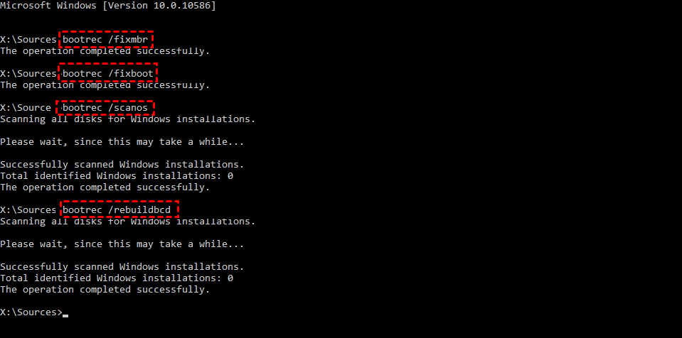 - حالا به ترتیب دستورهای exe /fixmbr و سپس bootrec.exe /fixboot سپس bootrec.exe /scanos و در نهایت bootrec.exe /rebuildbcd را وارد کرده و پس از هر دستور کلید Enter را بزنید.