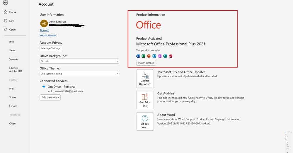 فایل Word ایجاد شده روی دسکتاپ را اجرا کنید و از منوی بالای صفحه آن به قسمت File > Account بروید. در قسمتی که مشابه عکس فوق مشخص شده است به راحتی می‌توانید نام دقیق ادیشن آفیس پیش فرض سرفیس را تشخیص دهید. این مسئله می‌تواند به شدت در خرید آفیس اورجینال سرفیس به شما کمک کند و منجر شود که بتوانید بدون نیاز به حذف ورژن فعلی و نصب مجدد یک ورژن جدید، صرفا آفیس مناسب همین ادیشن را بخرید و با لایسنس آن، فعال سازی را تکمیل نمایید. برای مثال ما برای فعال سازی آفیس پیش فرض سرفیسی که در تصویر فوق می‌بینید یک لایسنس آفیس 2021 پرو پلاس تهیه نمودیم و با آن Office پیش فرض سرفیس را فعال کردیم.