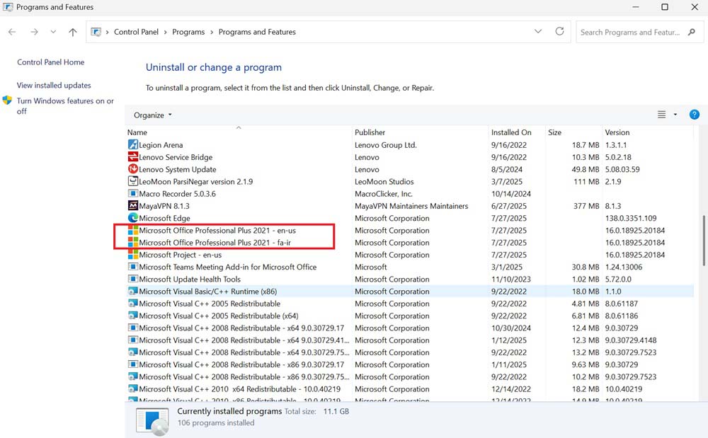 یک روش دیگر هم برای تشخیص نسخه آفیس فعلی نصب شده روی سرفیس وجود دارد که بسیار کاربردی است. در این روش کافیست به مسیر Control Panel > Uninstall a Program بروید یا اینکه به صورت همزمان کلید های Windows + R را از روی صفحه کلید فشار داده و دستور appwiz.cpl را وارد کرده و Enter بزنید. بدین ترتیب لیست نرم افزار ها و تمام آیتم هایی که روی کامپیوتر و ویندوز سیستم نصب هستند نمایش داده می‌شود. در این لیست به دنبال عبارت Microsoft Office باشید و وقتی آن را پیدا کردید می‌توانید از نام قید شده آن متوجه شوید که دقیقا مربوط به کدام ادیشن آفیس می‌شود و به نوعی نسخه آفیس پیش فرض سرفیس که روی آن نصب است چیست.