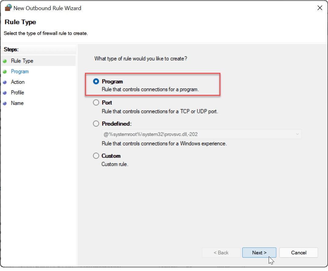 در این مرحله گزینه Program را انتخاب کنید و روی Next کلیک نمایید.