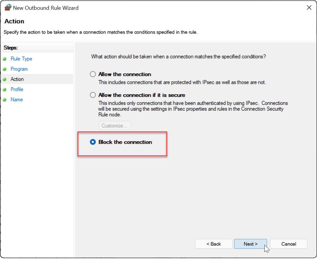 گزینه Block Connection را انتخاب کرده و روی Next کلیک کنید.
