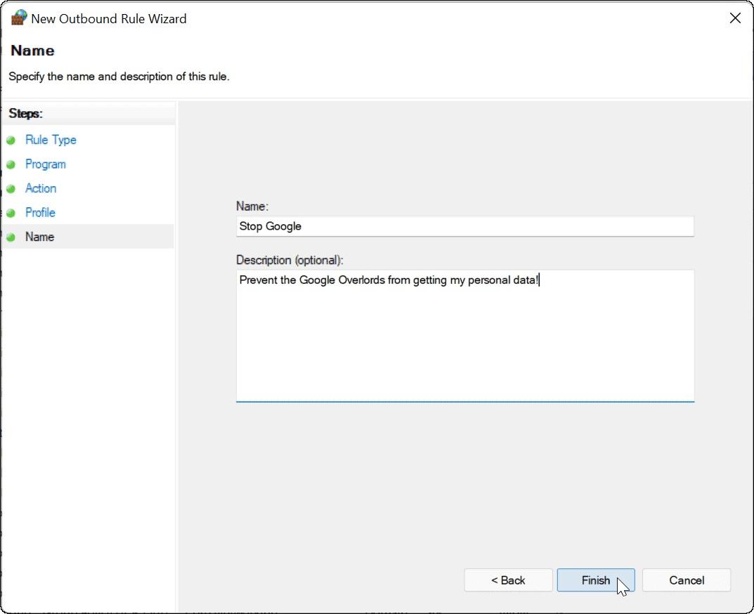 یک نام دلخواه برای دسترسی بلاک برنامه مورد نظر انتخاب و وارد کرده و روی گزینه Finish کلیک کنید. بدین صورت دسترسی آن برنامه به اینترنت کاملا قطع میشود و عملا قرار دادن نرم افزار در فایروال ویندوز با موفقیت انجام شده است.