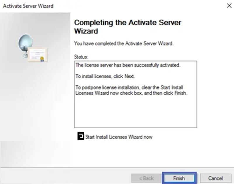 پس از طی کردن چند مرحله ساده نصب انجام شده و تصویری مشابه عکس فوق پیش رویتان قرار میگیرد. تیک گزینه Start Install Licenses Wizard را بزنید و روی Finish کلیک کنید تا نصب RDS License Server تکمیل گردد. پس از تکمیل این فرآیند نوبت به نصب و فعالسازی لایسنس ریموت دسکتاپ میرسد.