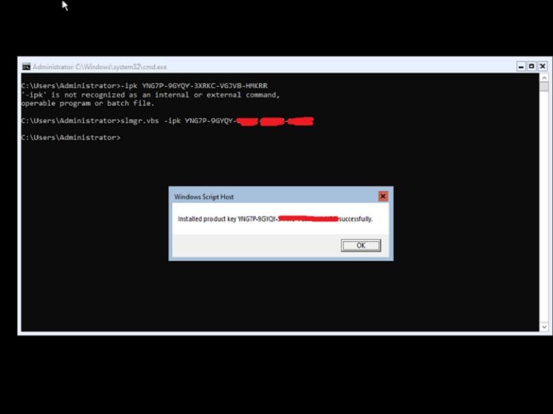- دستور vbs –ipk XXXX-XXXX-XXXX-XXXX را تایپ کرده به جای X ها کد لایسنس ویندوز سرو را وارد کنید و Enter بزنید.