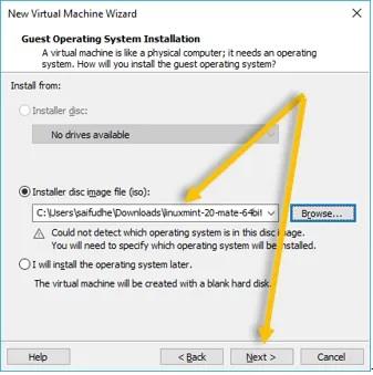 ابتدا برنامه VMware را اجرا کرده و روی گزینه های File > Virtual Machine کلیک کنید تا دستور ساخت یک ماشین مجازی ارائه شود. اگر از برنامه دیگری هم استفاده می‌کنید باید دنبال گزینه مشابهی باشید که ساخت ماشین مجازی را میسر می‌سازد. در صفحه‌ای که مشابه با عکس فوق ظاهر می‌شود گزینه Installer disk image file (iso) را انتخاب نمایید و روی گزینه Browse کلیک کرده و فایل Linux Mint که در ابتدای امر دانلود کرده بودید را انتخاب کنید. سپس روی گزینه Next کلیک کنید.