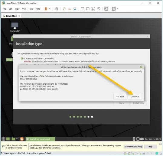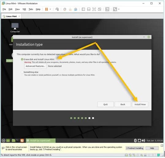 در این مرحله گزینه Erase disk and install Linux mint را انتخاب کرده و روی Install now کلیک نمایید. بدین ترتیب دستور شروع نصب لینوکس در VMware به طور رسمی ارائه می‌شود.