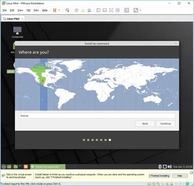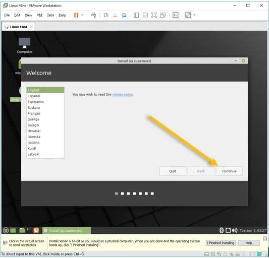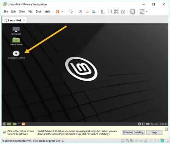 پس از چند ثانیه با محیطی مشابه عکس فوق رو به رو خواهید شد. خیل از کاربران تصور می‌کنند که با نمایان شدن این صفحه پروسه نصب لینوکس در VMware با موفقیت انجام شده اما اینطور نیست و صفحه ارائه شده صرفا رابطی است که در محیط لینوکس امکان ادامه دادن پروسه نصب را فراهم می‌سازد. برای ادامه و تکمیل این پروسه آیکونی که به شکل یک CD و با نام Install Linux Mint روی صفحه مشخص شده را اجرا نمایید.