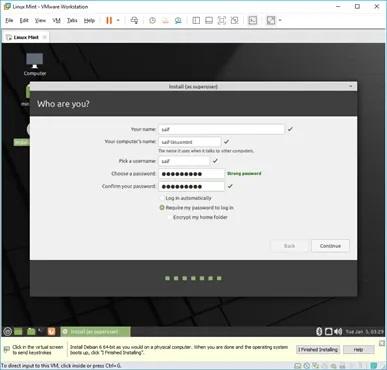 در این مرحله باید یوزرنیم و پسورد مد نظرتان را به عنوان ادمین لینوکس وارد و مشخص نمایید و روی گزینه Continue کلیک کنید.