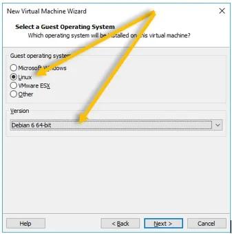 از آنجایی که لینوکس بر پایه دبیان (Debian) است از لیست گزینه Linux را انتخاب کنید و برای منوی کشویی پایین آن هم گزینه Debian 6 64-bit را انتخاب نمایید. سپس روی گزینه Next کلیک کنید.