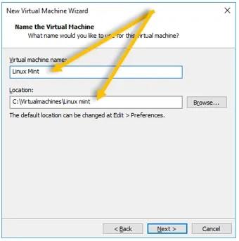 حالا باید نامی که می‌خواهید برای ماشین مجازی شما در نظر گرفته شود را در فیلد اول تایپ کنید و در فیلد دوم هم مسیر نصب لینوکس در VMware ویندوز را مشخص نمایید. پس از انجام این دو مورد، روی گزینه Next کلیک کنید.