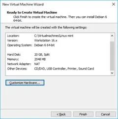 در مرآموزش نصب لینوکس در VMware (ماشین مجازی ویندوز) له های بعدی باید به ترتیب فضای هارد، مموری و دیگر ویژگی های سخت افزاری که می‌خواهید برای ماشین مجازی شما در نظر گرفته شوند را انتخاب کنید. این گزینه ها با توجه به سلیقه شخصی شما و همچنین پتانسیل سیستم انتخاب خواهند شد. سعی کنید مقادیر مذکور را به گونه‌ای تعیین نمایید که نه با اجرای لینوکس از طریق ماشین مجازی، سیستم تحت فشار قرار بگیرد و نه مشخصات در نظر گرفته شده برای ماشین مجازی به قدری ضعیف باشد که سرعت و کیفیت عملکرد آن مطلوب نشود. پس از اینکه مقادیر مورد نظر را انتخاب کردید روی گزینه Finis کلیک کنید تا ساخت ماشین مجازی در VMware به پایان برسد.
