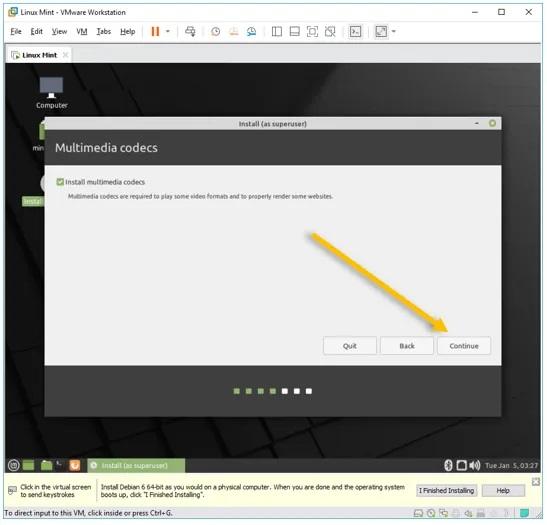 در مرحله بعدی تصویری مشابه با عکس فوق پیش رویتان قرار می‌گیرد. اگر می‌خواهید کدک های مورد نیاز جهت اجرا و تماشای فیلم و سریال و فایل های ویدیویی مختلف در لینوکس نصب گردد، تیک گزینه ارائه شده را بزنید اما اگر نیازی به این کدک ها برای اجرای فایل های ویدیویی ندارید، می‌توانید تیک گزینه مذکور را نزنید. توصیه ما این است که تیک گزینه دانلود و نصب کدک ها را بزنید و اجازه دهید فایل های مربوط به آن دانلود و نصب شوند. پس از انتخاب گزینه موردنظرتان روی Continue کلیک کنید.