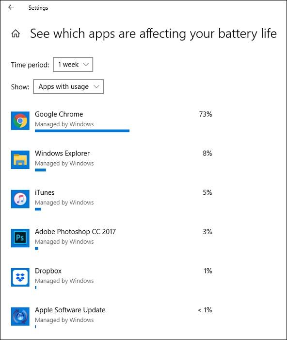 اما چطور لیست برنامه های نصب شده روی سیستم و مصرف انرزی هر یک را مشاهده کنیم؟ برای انجام این کار در ویندوز 10 کافیست به مسیر Settings > Battery بروید تا درصد شارژ باقی مانده باتری لپ تاپ نشان داده شود. حالا روی عبارت آبی رنگ See Which Apps Are Affecting Your Battery Life که زیر درصد باتری ارائه شده کلیک کنید. مشاهده خواهید کرد لیست برنامه های نصب شده روی ویندوز و همچنین میزان مصرف انرژی هر برنامه نمایش داده می‌شود. بدین ترتیب قادر به شناسایی برنامه های پرمصرف و حذف آن ها خواهید بود که انجام این کار تاثیر قابل ملاحظه‌ای روی زود خالی شدن شارژ باطری دارد.