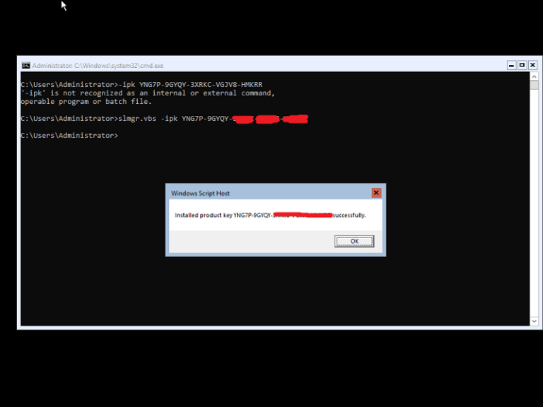 این روش فعالسازی مربوط به بکارگیری دستورات CMD میشود. بنابراین هم در نسخه Core و هم Desktop Experience قابل استفاده است. اگر نسخه Core ویندوز سرور را نصب کرده باشید به طور خودکار با پنجره CMD رو به رو میشوید اما اگر نسخه Desktop Experience را نصب کرده باشید باید پنجره CMD را با تایپ عبارت مذکور در فیلد جستجو و سپس اجرای آیکون مربوط به آن در حالت Admin فعال نمایید. سپس دستوری Slmgr.vbs –ipk XXXX-XXXX-XXXX-XXXX را وارد کنید و به جای X های دستور، کد لایسنس را وارد کنید. سپس Enter بزنید و چند ثانیه منتظر باشید تا فعالسازی انجام شود.